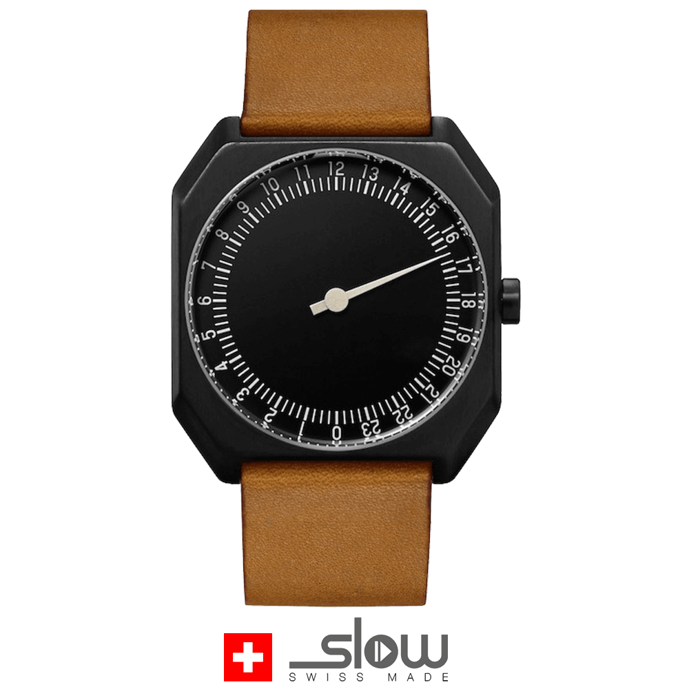 ساعت مچی سوئیسی SLOW "JO" – 19، در این مدل ساعت مچی سوئیسی قاب استیل تمام مشکی به همراه بند چرمی ویژه قهوه
